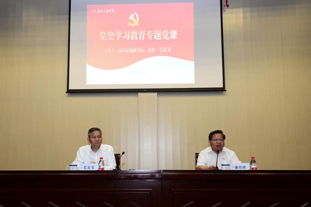 盛付祥表示,党课内容思想深刻,不仅让全体师生享受了一道丰盛的“精神大餐”,更让大家备受鼓舞、倍感振奋、倍增干劲。就如何贯彻落实毛宏芳市长专题党课的精神,进一步开展好党史学习教育,推动学校事业高质量发展,盛付祥提了三点意见:一要提高政治站位,迅速掀起学习贯彻专题党课的热潮。二要压紧压实责任,高质量完成党史学习教育目标任务。三要坚持创新实干,高起点书写学校事业发展崭新篇章。盛付祥要求,学校要在新的办学起点上,大力弘扬红船精神,锚定未来目标,坚守初心、坚定信心,牢固树立命运共同体、责任共同体意识,主动对接嘉兴产业发展需求,协同整合多方资源,深化校地合作,提升服务能力,为打造“重要窗口”最精彩板块、建设“五彩嘉兴”作出更大贡献,以优异成绩迎接建党百年!