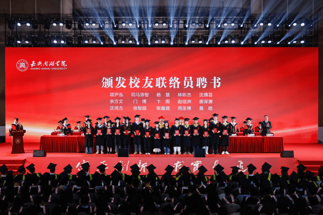 全体出席校领导为获得表彰的学生代表颁发荣誉证书,为2024届毕业生代表颁发毕业证书,为校友联络员颁发聘书。倪沪平为“南湖证书”获得者颁发证书。